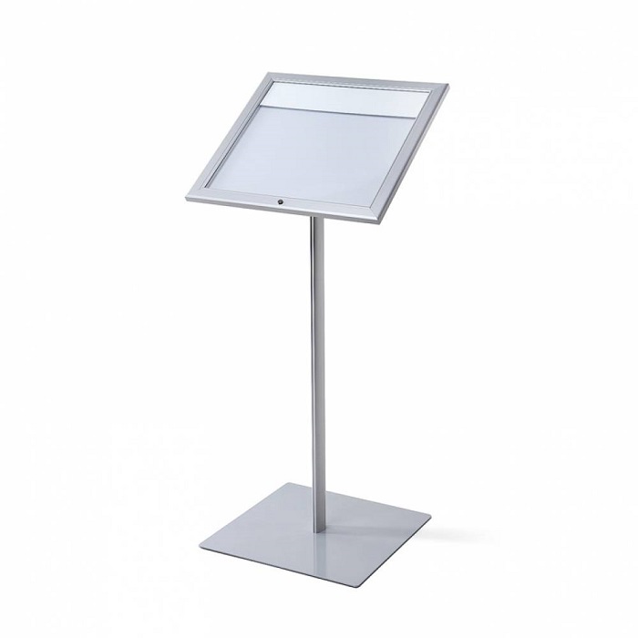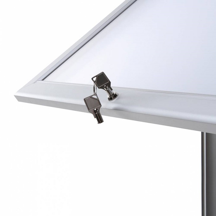 Der eloxierte Menüständer ermöglicht die Präsentation von bis zu 2 DIN A4 Seiten in senkrechter Ausrichtung und schützt Ihre Inhalte zuverlässig vor unbefugtem Zugriff dank der abschließbaren Ausführung. Die magnethaftende Rückwand erleichtert den Austausch Ihrer Einlagen.