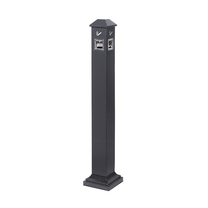Der Aschenbecher mit Stahlkonstruktion ist auf allen vier Seiten gut nutzbar und in der Farbe schwarz erhältlich. Dank der Öffnung an der Seite (mit Sicherheitsschloss) ist eine einfache Entleerung und Reinigung möglich. Einfach aufschließen, öffnen und entleeren!