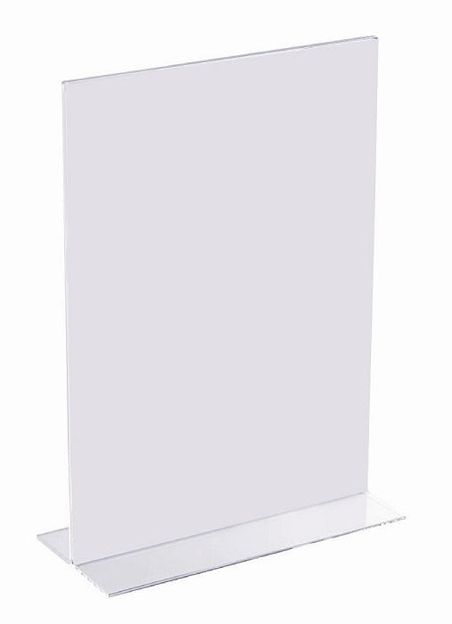 Formschöner und transparenter T - Aufsteller aus klarem Acryl für eine Aufstellung auf Tisch oder Theke für die Verwendung im Hochformat oder wahlweise im Querformat in den Ausführungen DIN A3, DIN A4, DIN A5 und DIN A6.