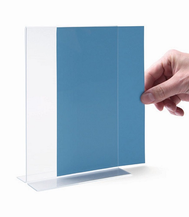 Dieser T - Aufsteller besteht aus stabilem, glasklarem 1,5 mm - 2,5 mm starkem Acrylglas (je nach DIN Größe). Zum Wechsel der Einleger (beidseitige Blatteinlage möglich) wird die Tasche einfach am unteren Teil geöffnet und das Werbematerial kann jederzeit schnell und unkompliziert ausgetauscht werden.
