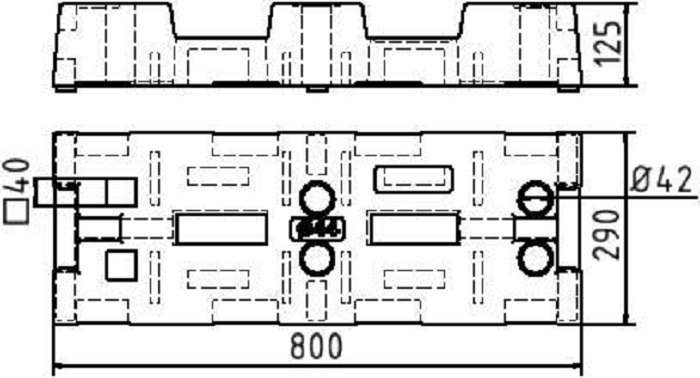 Des Weiteren verfügt der Bauzaun Fuß über 4 Löcher mit Ø 42 mm und 2 Löchern 40 x 40 mm zum Einstecken der Bauzaunstandrohre bzw. Aufnahme der Bauzäune und Tragegriffe.