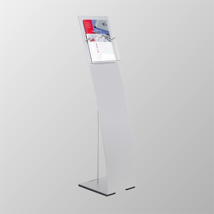 Der praktische Bodenständer ist die elegante Lösung zur Präsentation von Flyern, Broschüren oder Infomaterial. Sein modernes, leicht gebogenes Design und die hochwertige Verarbeitung machen ihn ideal für Büro, Empfangsbereich, Messestand oder Wartebereich.