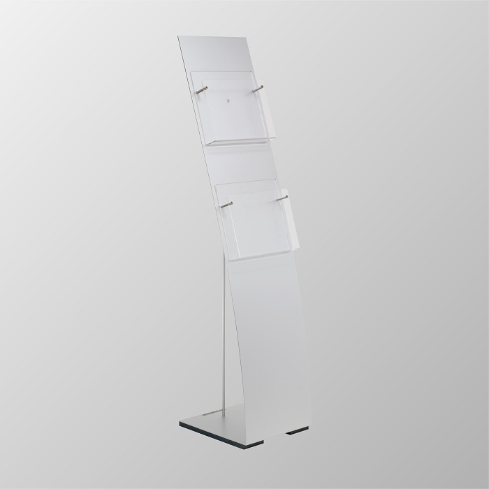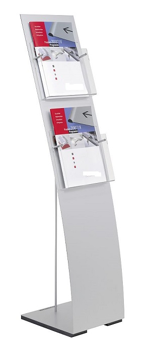Der Prospektständer besteht aus Silber eloxiertem Aluminium und verfügt je nach Variante über ein oder zwei Prospekthalter aus Acryl. Die schwere Bodenplatte sorgt für besondere Standfestigkeit und Stabilität.