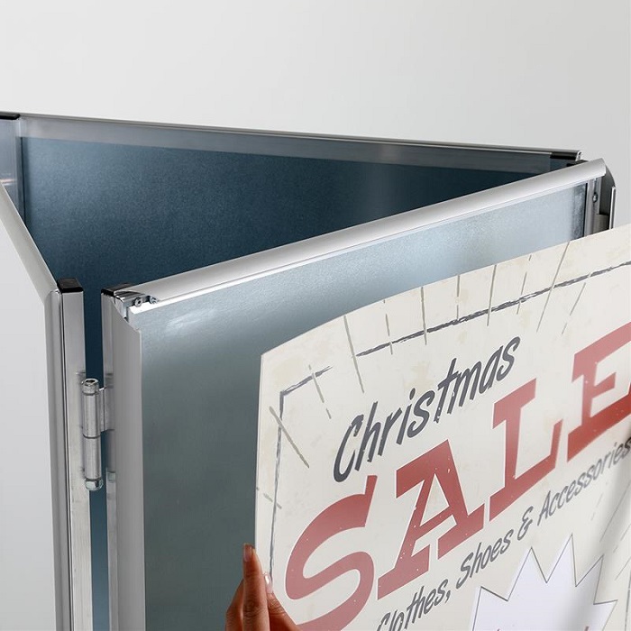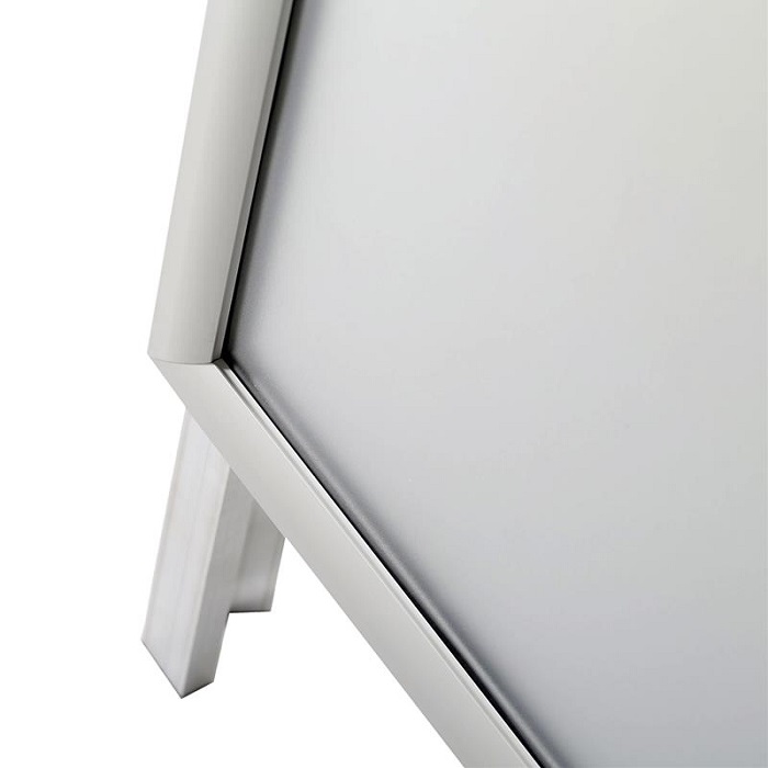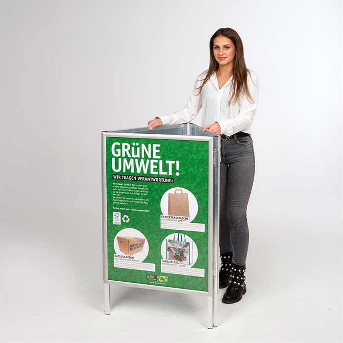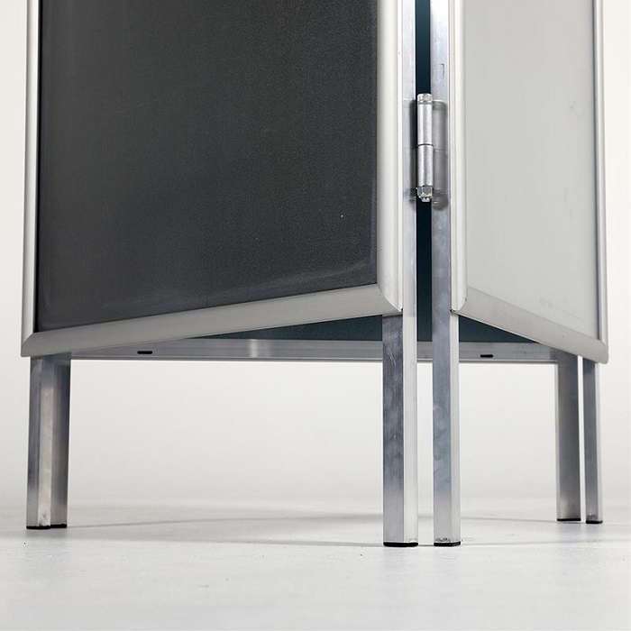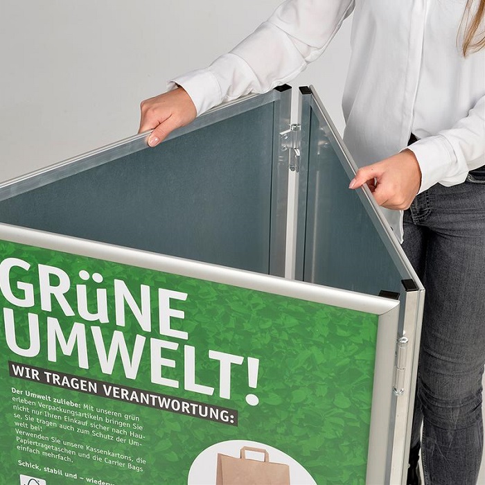 Das stabile, faltbare Gestell aus Aluminium Rechteckprofilen sorgt für langlebige Nutzung, während die bewährte Klapprahmentechnik einen schnellen und einfachen Motivwechsel ermöglicht. Geschützt werden Ihre Plakate durch transparente PET-Schutzfolien im Format DIN A1.
