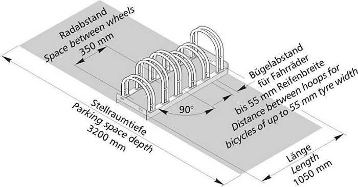Wir bieten den zweiseitigen Fahrradständer 5000 für 4, 6, 8, 10 und 12 Einstellplätze für Fahrräder an. Diese Version ist für eine zweiseitige Radeinstellung! Der Fahrradständer ist auch für Mountain Bikes geeignet, da der Bügelabstand für Reifenbreiten bis 55 mm ausgelegt ist.