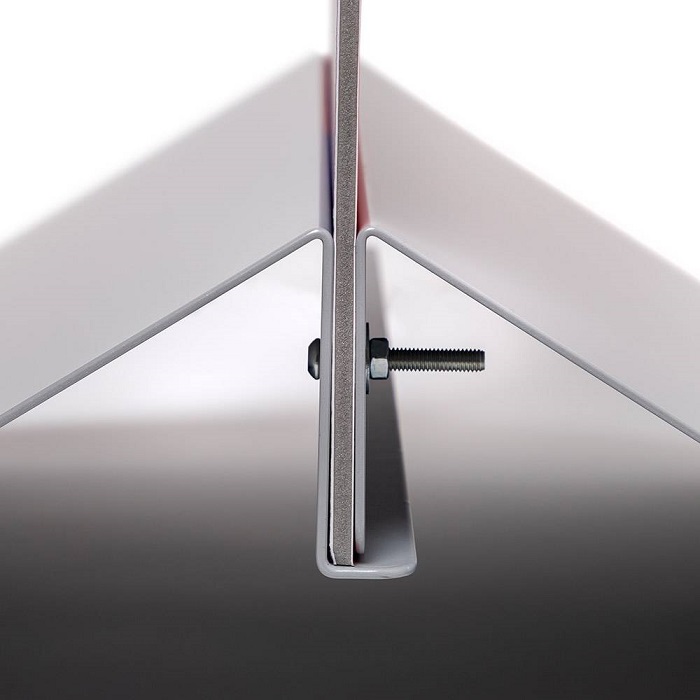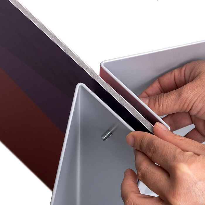 Das System besteht aus einem Stahlsockel und die Einleger werden unten mit Schrauben fixiert. Die Stärke der Werbemedien (starre Materialien z.B. eine bedruckte PVC Hartschaumplatte) kann zwischen 3 mm bis zu 32 mm variieren. Die Lieferung erfolgt ohne Werbepanel.