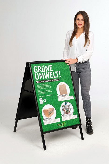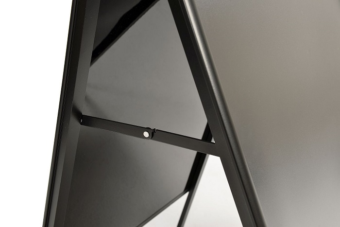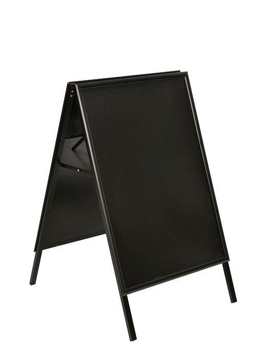 Kundenstopper Black mit aufmontierten 25 mm Klapprahmen, schlagfester Polystyrol Rückwand und Ecken auf Gehrung für das Format DIN A1.