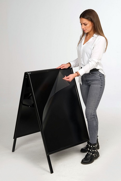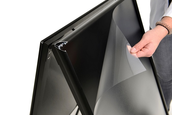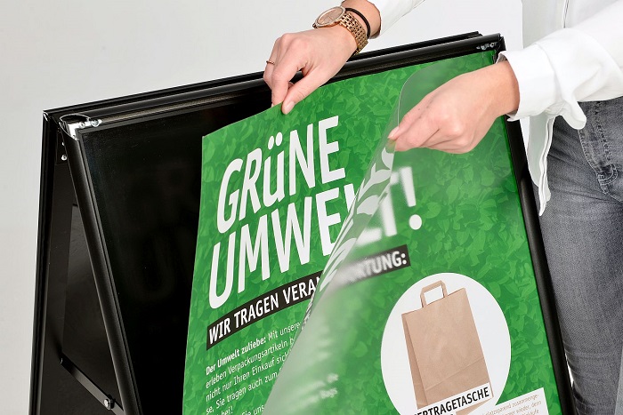 Geschützt werden Ihre Plakate durch Schutzfolien. Dank der Qualität, geben die Klemmen auch nach häufigem Öffnen ihrer Werbung stets sicheren Halt und Ihr Gehwegaufsteller ist bestens gerüstet für ein langes Leben.