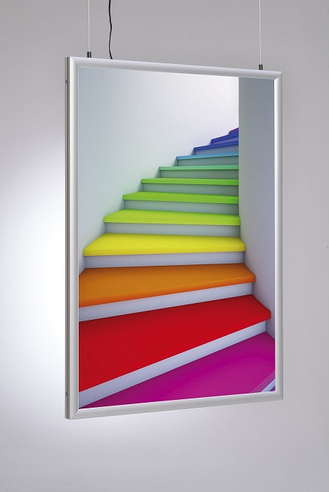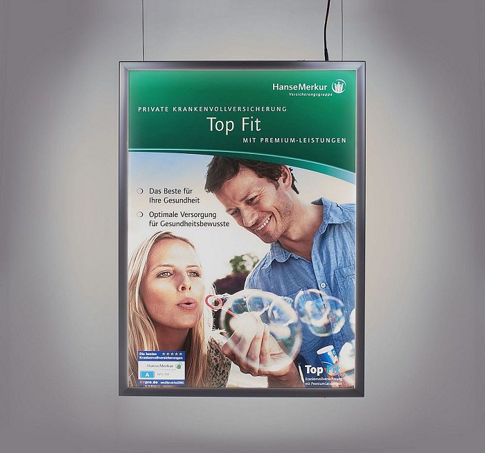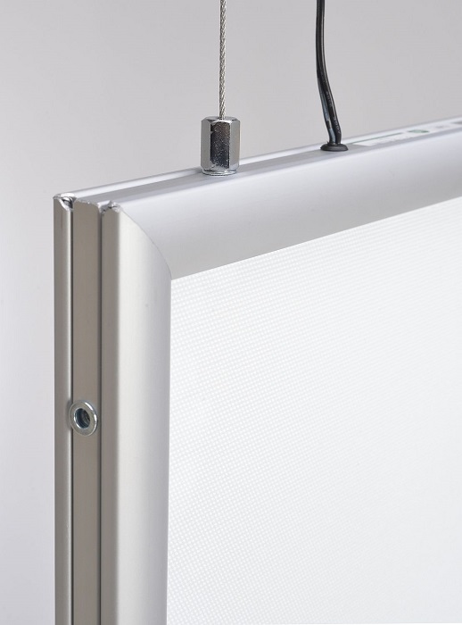 Die Befestigung des doppelseitigen LED Leuchtrahmen Economy erfolgt dank der integrierten Seil Abhängung im Querformat oder wahlweise im Hochformat.