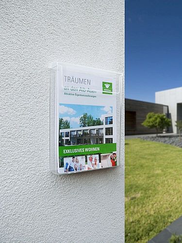 In diesem transparentem Wand Prospekthalter finden jede Menge Infos Platz.