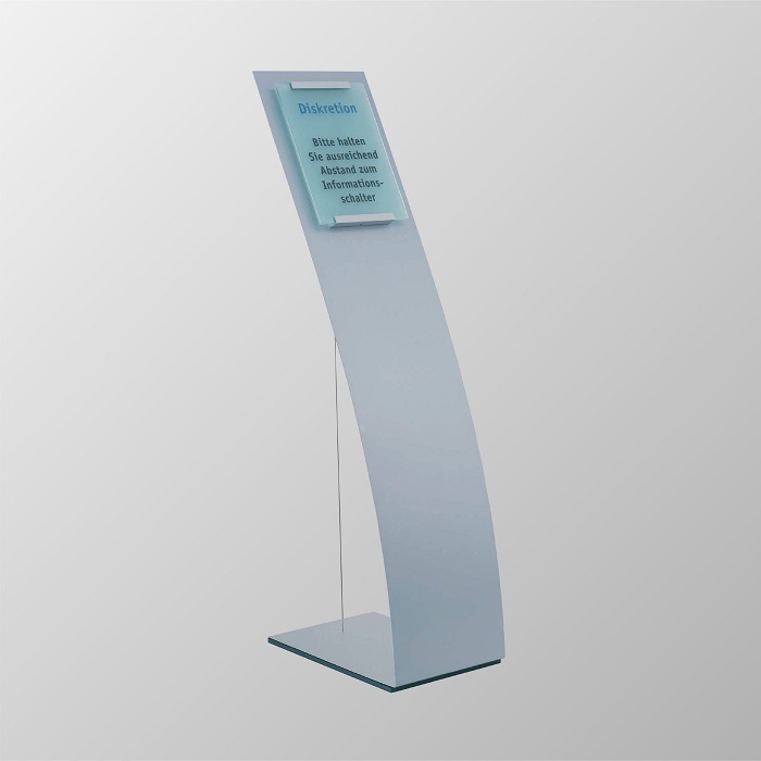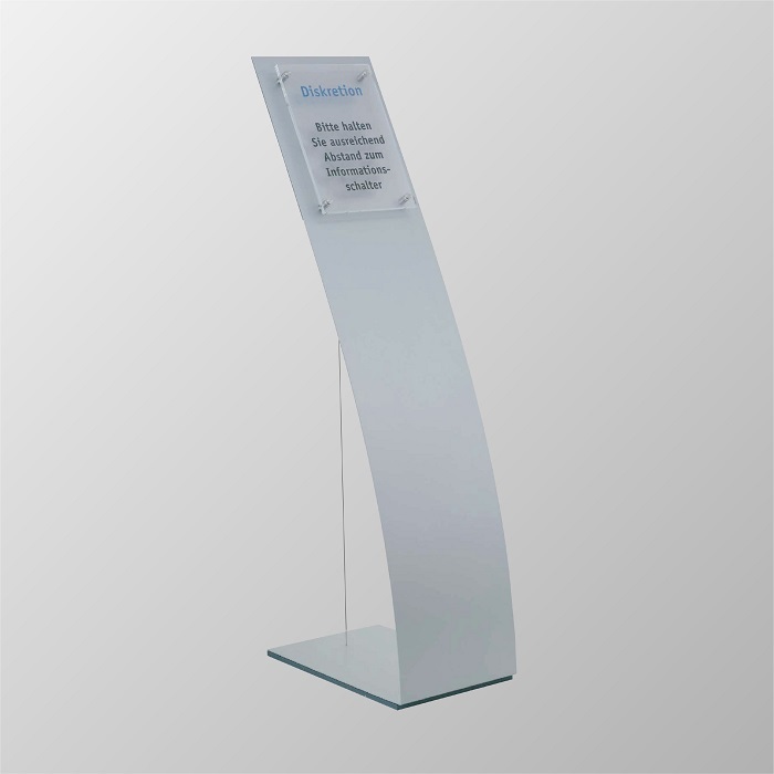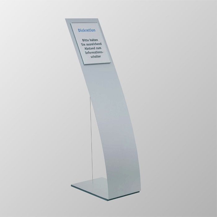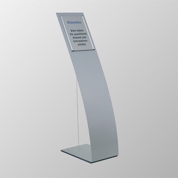 Der Infoständer hat ein leicht gebogenes Design. Er ist auf Spannung gebogen und wird mit einem dünnen Drahtseil gehalten. Besonders standfest und stabil ist er durch die schwere Bodenplatte. Das Stahlseil ist mit der Bodenplatte fest verankert und wird oben durch eine Verschraubung gespannt.