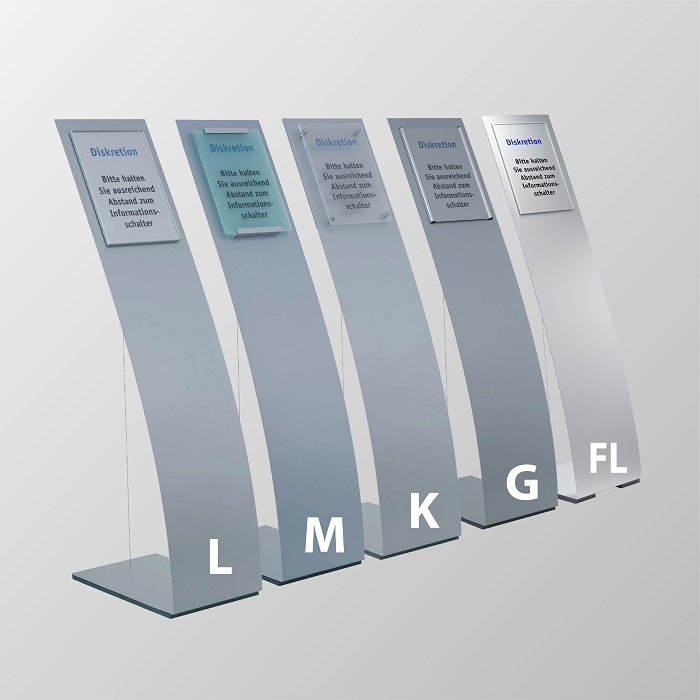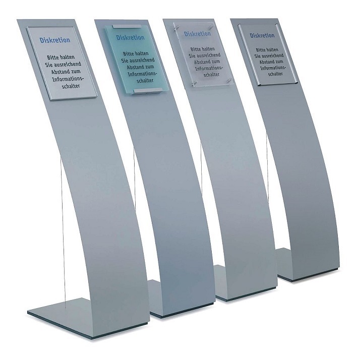 Der Ständer ist aus Silber eloxiertem Aluminium gefertigt und hat je nach Variante Informationsschilder in DIN A4 oder DIN A3.Wir bieten 5 verschiedene Designs von Schildern an, UNITEX L, FL, K, G, und M. Bitte wählen Sie in den Varianten entsprechend aus.