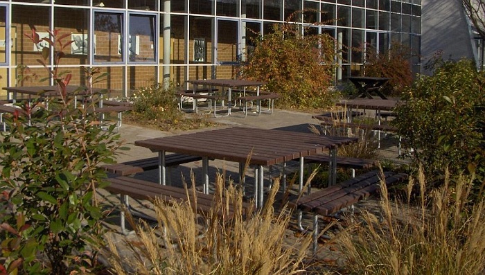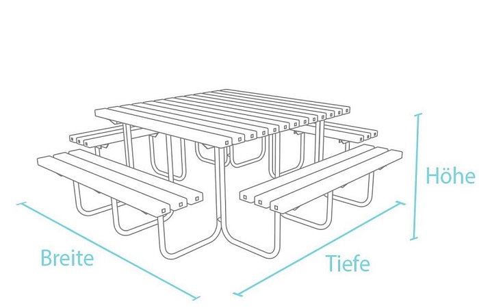 Ein Sitzvergnügen im Quadrat. Solchermaßen in Szene gesetzt passt die Sitzgruppe in geschäftige Stadtbilder, in den Biergarten, auf den Schulhof, in Kur und Freizeiteinrichtungen und vieles mehr.