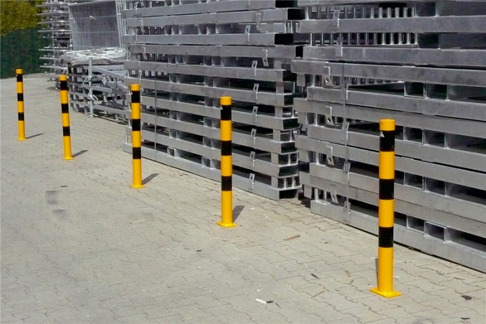 Sperrpfosten Ø60 x 2,5mm zum Aufdübeln feuerverzinkt und gelb beschichtet mit drei schwarzen Streifen speziell für den Werkschutz.