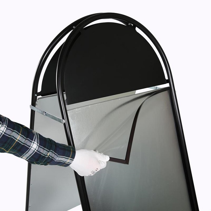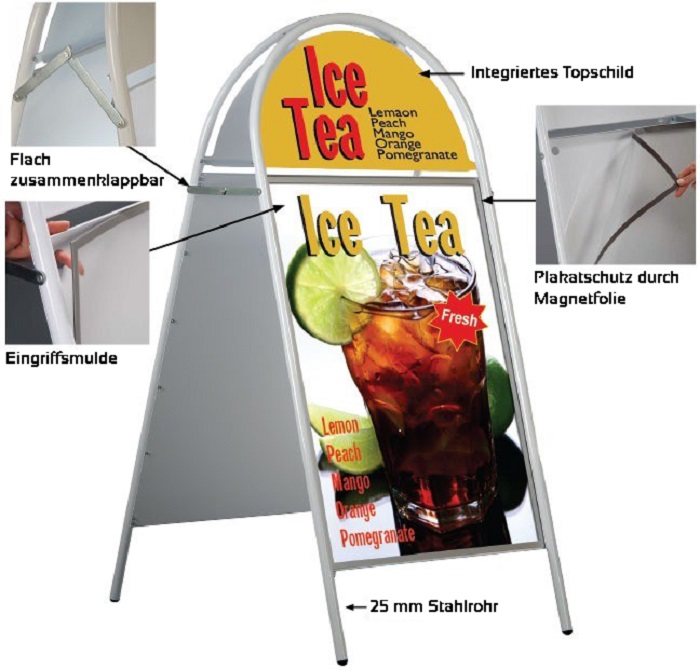 Die Plakatabdeckung erfolgt über eine praktische Magnetfolie, die das Einlegen von Werbeplakaten besonders einfach macht. Für den Außeneinsatz empfehlen wir den Plakatdruck auf wetterfester Folie. Der Stahlrohr Kundenstopper ist für DIN A1 Formate erhältlich und wahlweiße in weiß oder schwarz pulverbeschichtetem Stahlrohrrahmen verfügbar - perfekt für Gastronomie, Handel und Events.