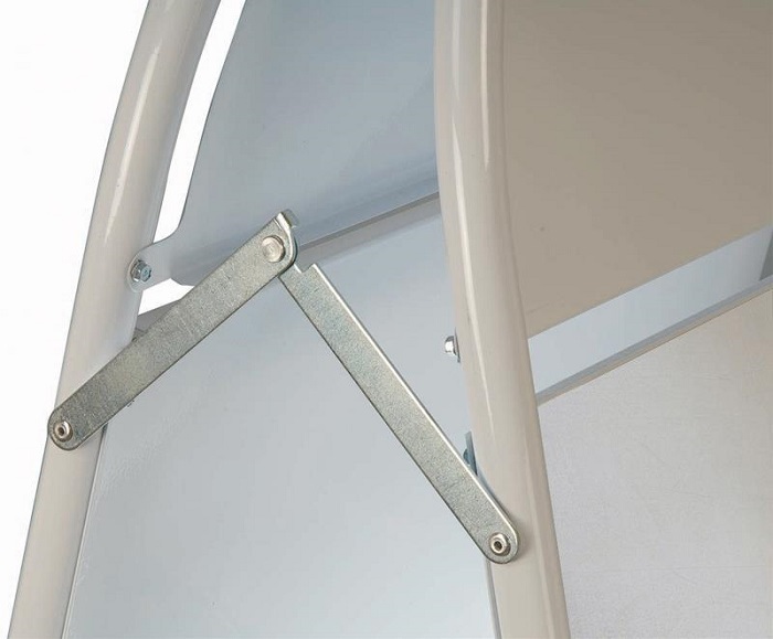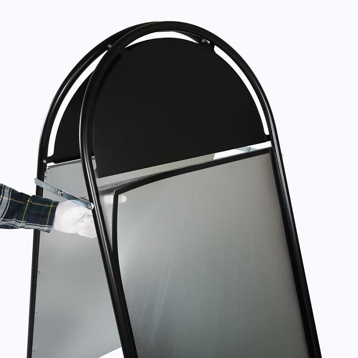 Gefertigt aus robustem 25 mm Stahlrohr, überzeugt der Gehweg-Aufsteller durch seine hohe Stabilität und Langlebigkeit. Ein integriertes Topschild dient als permanente Logo- oder Werbefläche oberhalb des Rahmens und sorgt für maximale Aufmerksamkeit.