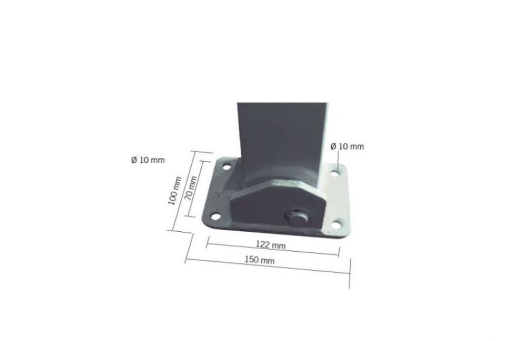 Der Absperrpfosten besteht aus Stahlrundrohr mit Durchmesser 76mm und besitzt eine selbsteinrastende Verriegelung. Er ist zur Dübelbefestigung mittels Bodenplatte 100x150mm.