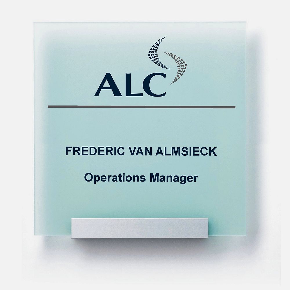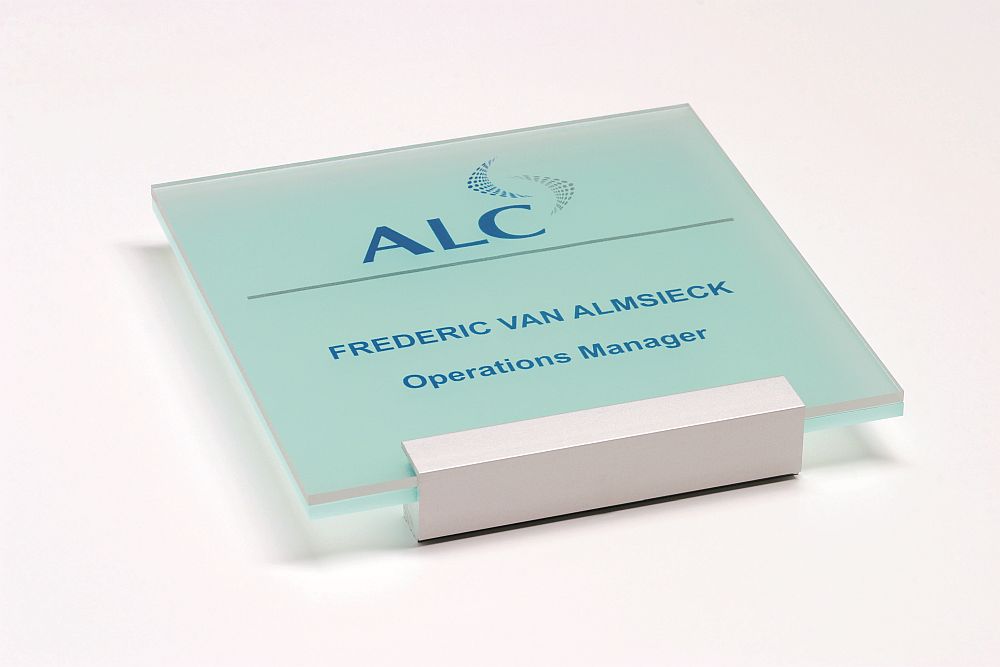 Ein innovatives Material wird mit innovativer Technik vereint. Das Türschild besteht aus zwei Scheiben, zwischen die eine beschriftete Folie eingelegt wird. Die hintere Scheibe aus grünlichem oder bläulichem, leicht milchigem Acrylglas ist mit einem soliden Aluminium-Vollmaterial fest an die Wand geschraubt. (Entsprechende Farbe bitte beim Bestellen auswählen)